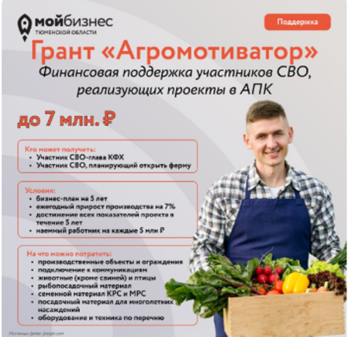 ДалееГрант «Агромотиватор» поможет ветеранам СВО начать своё дело в сельском хозяйстве.