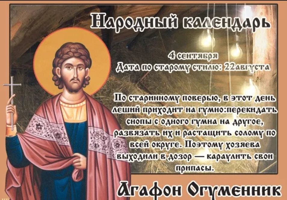Чтобы безобразия, связанного с соломой и снопами, не произошло, мужчины надевали тулупы, вывернутые наизнанку, повязывали головы полотенцами, брали кочергу, которой очерчивали вокруг амбара круг, и ночью сторожили свое имущество. "Агафон – гонит леших вон", – говорили в старину.