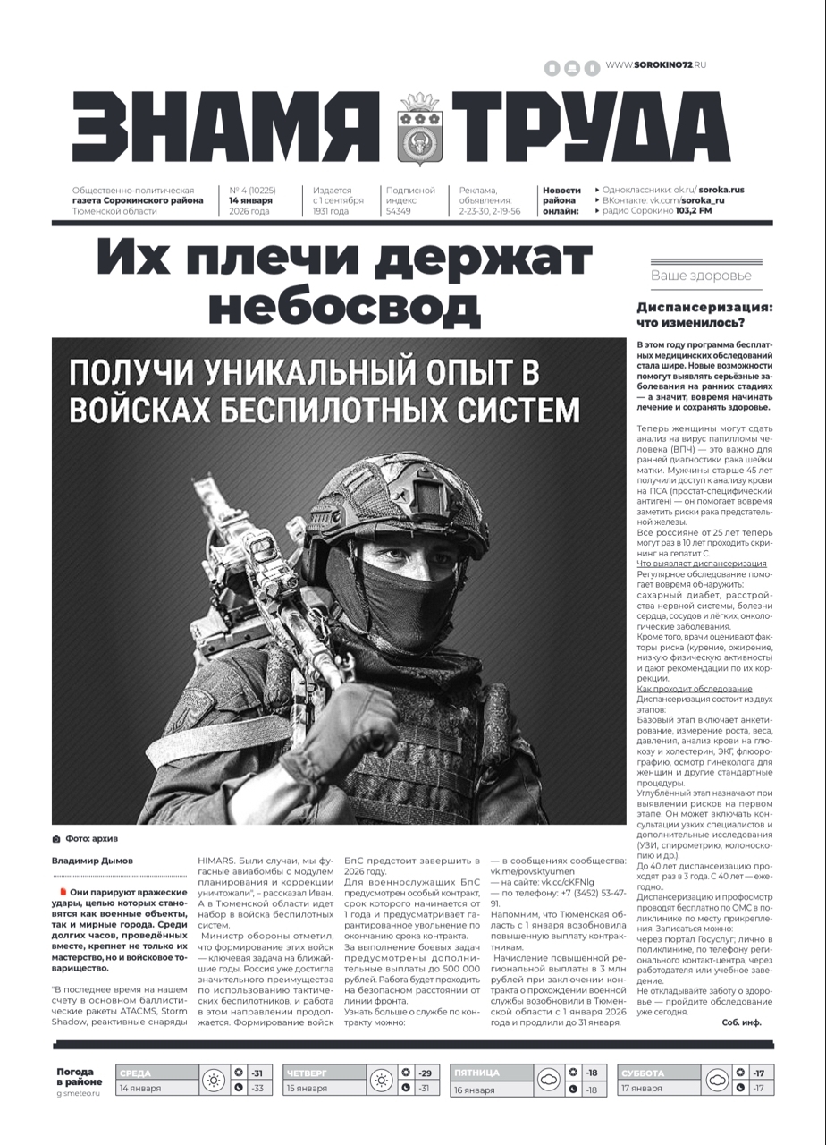 14 января 2026 года вышел очередной номер "Знамени труда". Кто успел оформить подписку до нового года, уже получают свежий выпуск, подготовленный сорокинскими журналистами.