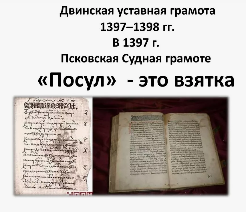 Мздоимство упоминается в русских летописях XIV века, например в Двинской уставной грамоте 1397 года в статье 6: "А самосуда четыре рубли, а самосуд то: кто изыснав татя с поличным, да отпустит, а собе посул возьмет, а наместники доведаются по заповеди, ино то самосуд, а опричь того самосуда нет". Там же, в статье 8: "...а черес поруку не ковати, а посула в железех не просити; а что в железех посул, то не в посул".