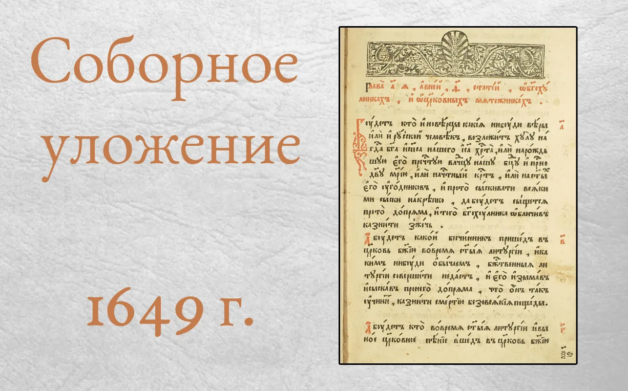 После восстаний 30–40-х годов XVII века уголовное законодательство приняло более карательный характер. Это получило свое воплощение в Уложении 1649 года. Уложение впервые дает определенную классификацию преступлений. Были выделены специальные подгруппы преступлений: государственные (политические) и против порядка управления. Собственно уголовные преступления можно подразделить на две подгруппы: должностные и против прав и жизни частных лиц.