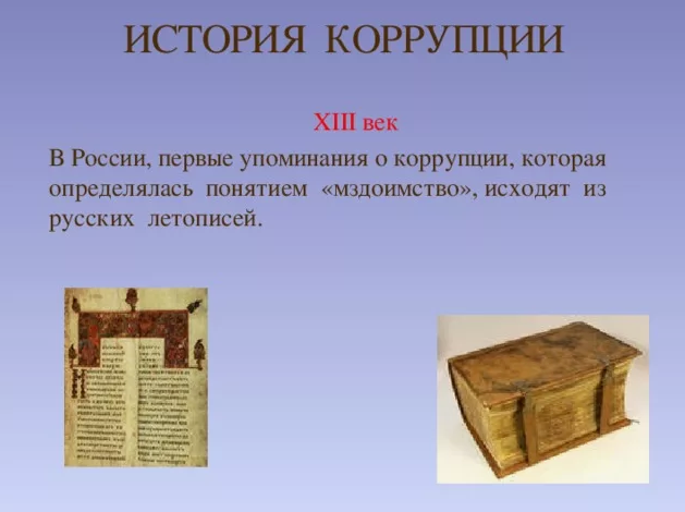 Мздоимство впервые упоминается в русских летописях XIII века. Можно говорить о том, что корыстные злоупотребления по службе возникли с появлением управляющих (вождей, князей) и судей как средство воздействия на их объективность и добросовестность при решении различных вопросов.