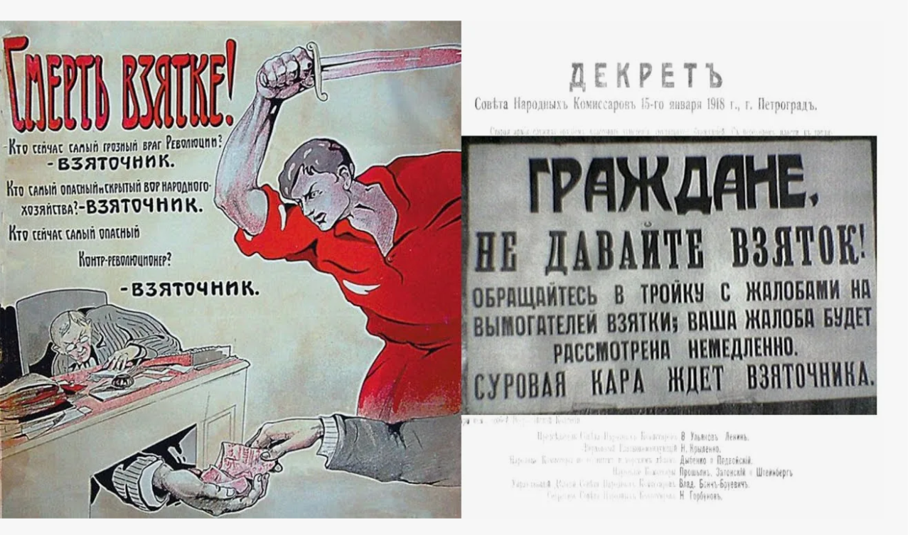 Вместе с тем советская власть с самого начала своего существования объявила войну коррупции. Подтверждением этому является принятие Декрета Совета Народных Комиссаров РСФСР от 8 мая 1918 года "О взяточничестве".