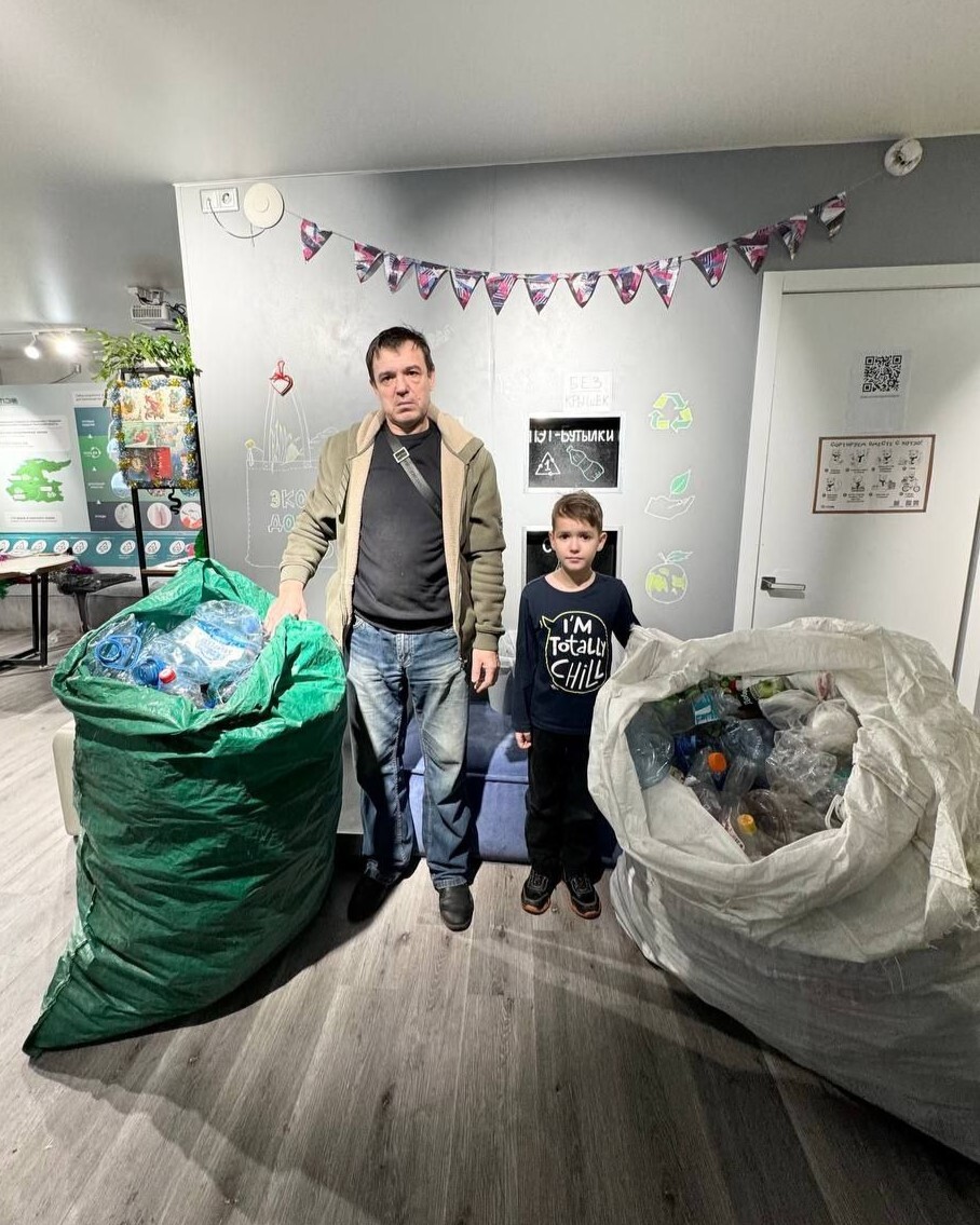 Многодетная семья из Тюмени Александр и Наталья Лисовские вместе со своими сыновьями сдали в экодом на переработку 40 килограммов пластиковых бутылок.