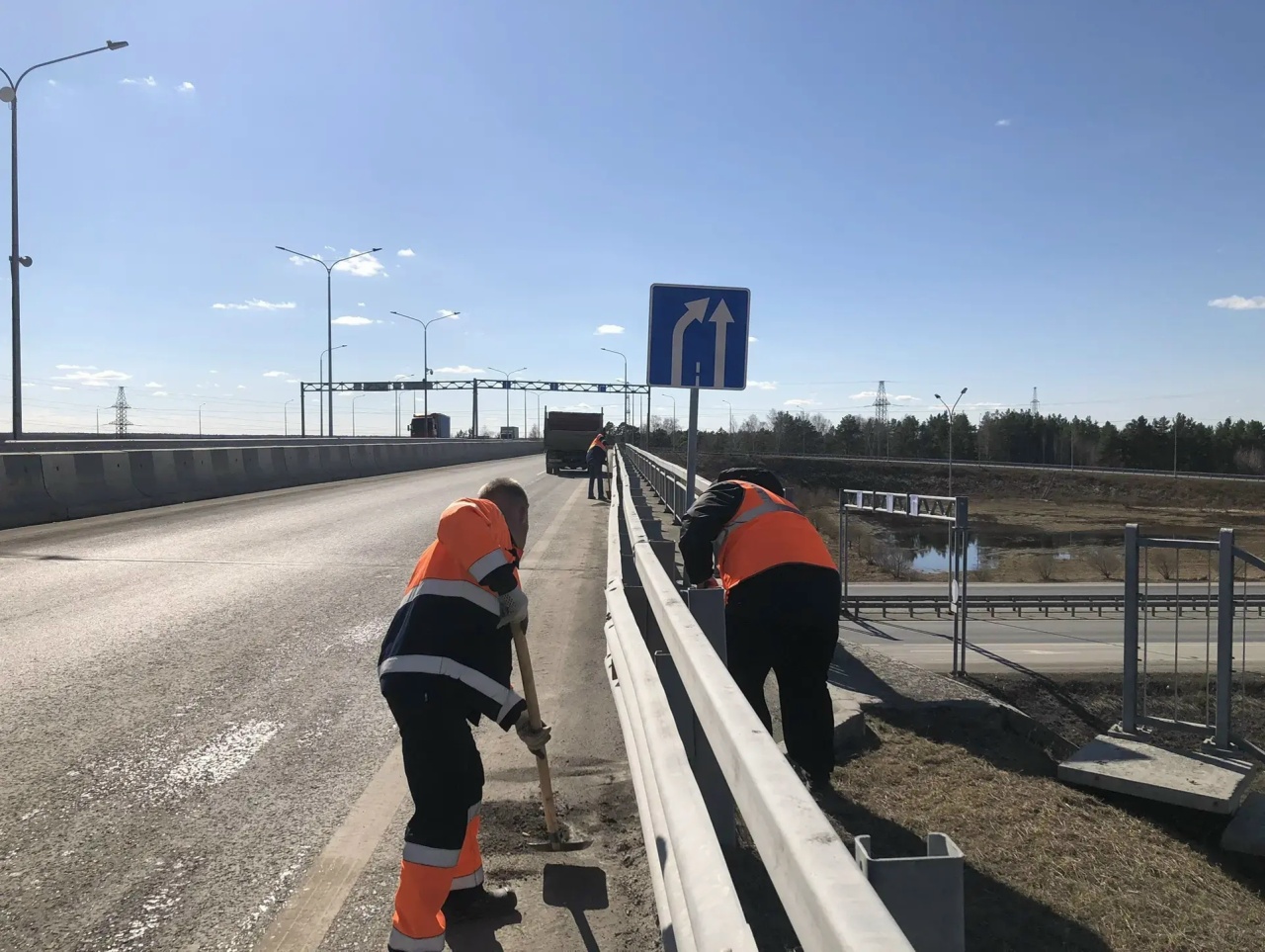 Очисткой ограждений, прибордюрной зоны, шумозащитных экранов занимаются бригады АО "ТОДЭП". Работы начались сразу же после схода снега.