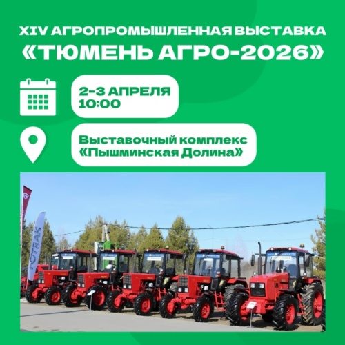 Далее2 и 3 апреля в рабочем посёлке Винзили Тюменского муниципального округа проходит агропромышленная выставка «Тюмень Агро-2026. Техника, Технологии, Инновации, Наука».