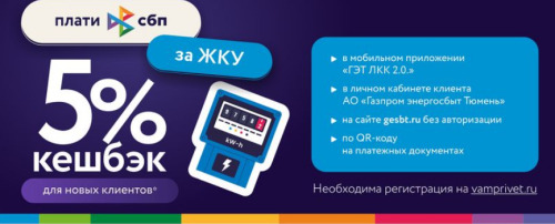 Оплачивайте ЖКУ через Систему быстрых платежей (СБП) в сервисах АО «Газпром энергосбыт Тюмень» или по QR-коду СБП на платежном документе и получите кешбэк 5%.